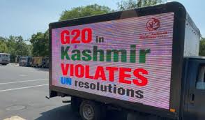 The electronic screens mounted on the trucks carried messages such as: “No Election, No Selection: UN Resolutions Only Solution” and “India: Stop Land Grabbing in Kashmir.”