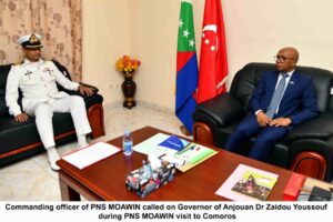 During its stay at the port, the Commanding Officer of PNS MOAWIN called on the Governor of Anjouan, Dr. Zaidou Youssouf, Deputy Chief of the Army Staff Colonel S.B. Dailami, and other civil and military leaders of Comoros. Various matters of mutual interest and opportunities for bilateral cooperation were discussed during these meetings. The Commanding Officer also conveyed warm greetings from Chief of the Naval Staff, Admiral Naveed Ashraf, to the Comorian authorities for their support extended to the visiting ship. Additionally, shipboard exercises and discussions on various operational matters were held onboard to enhance interoperability.