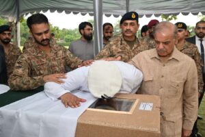 Prime Minister Muhammad Shehbaz Sharif, Minister for Defence Khawaja Muhammad Asif, Minister for Information and Broadcasting Attaullah Tarar, Chief of Army Staff (COAS) General Syed Asim Munir and a large number of serving and retired military officers, soldiers and relatives of Shaheed attended the funeral, PM Office Media Wing said in a press release.
